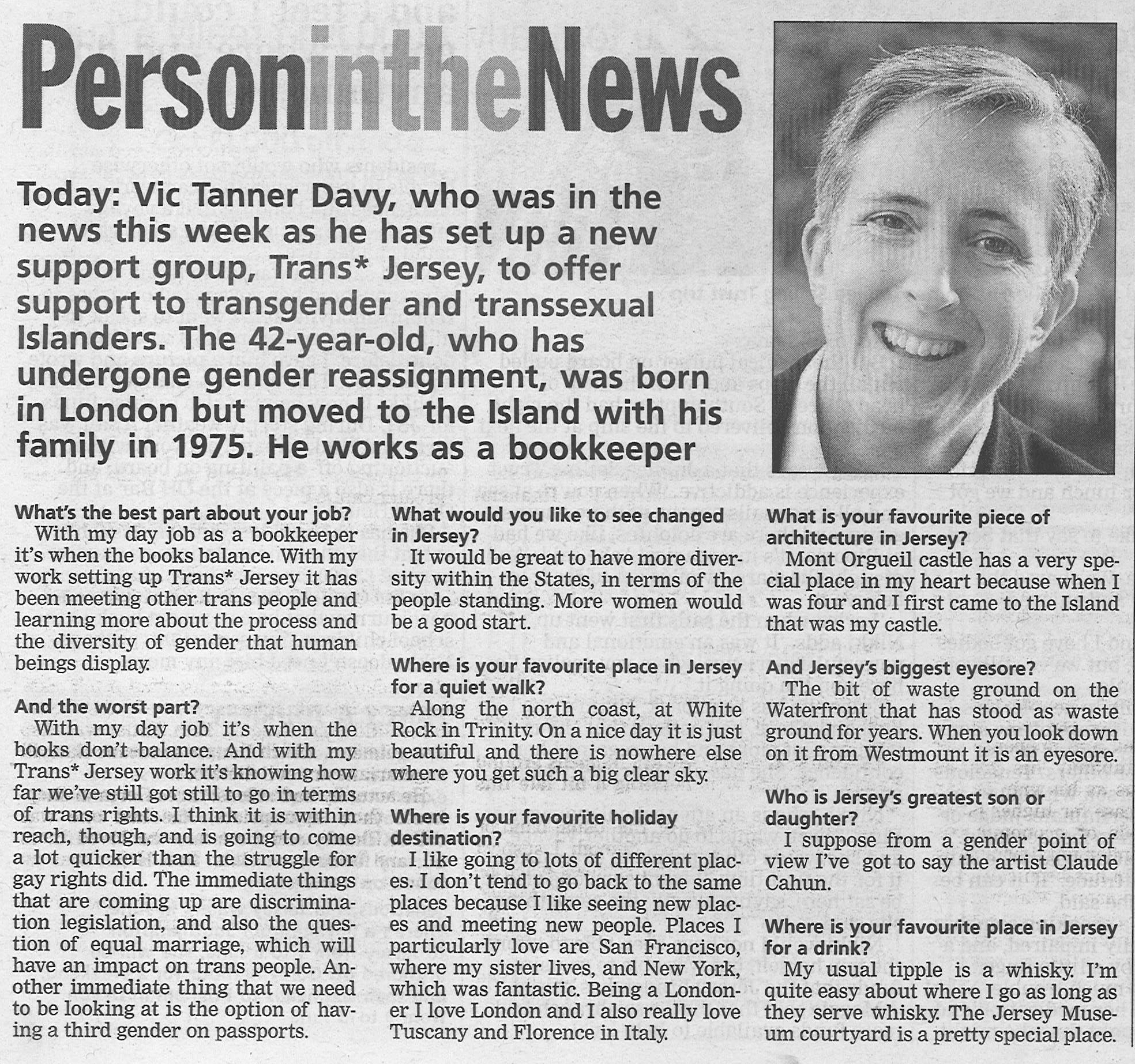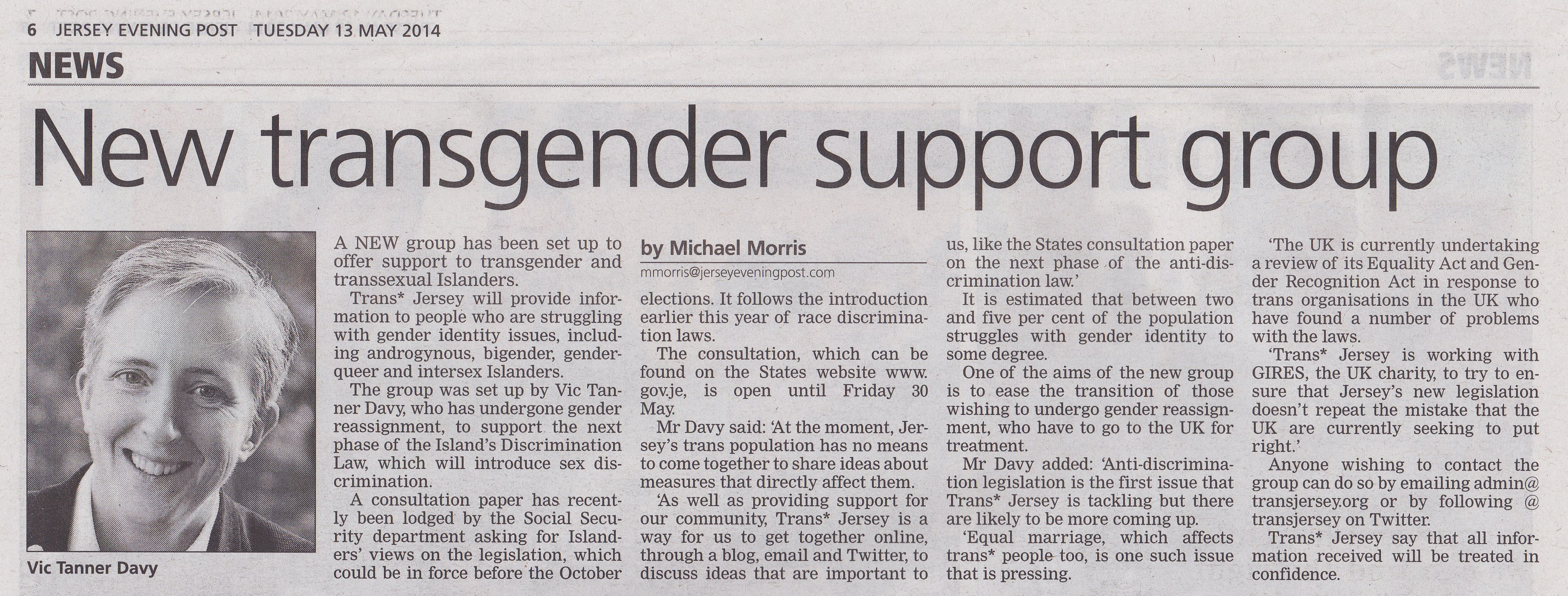 13 May, 201421 May, 2014 Trans* Jersey Media links: Launch of Trans* Jersey Channel TV report BBC Radio Jersey interview with Vic Tanner Davy (at time code 02:17) Bailiwick Express article Channel 103 news Jersey Evening Post: Thursday 15 May 2014: Share this: Click to share on X (Opens in new window) X Click to share on Facebook (Opens in new window) Facebook Click to share on LinkedIn (Opens in new window) LinkedIn Click to print (Opens in new window) Print Click to email a link to a friend (Opens in new window) Email Like Loading... Related