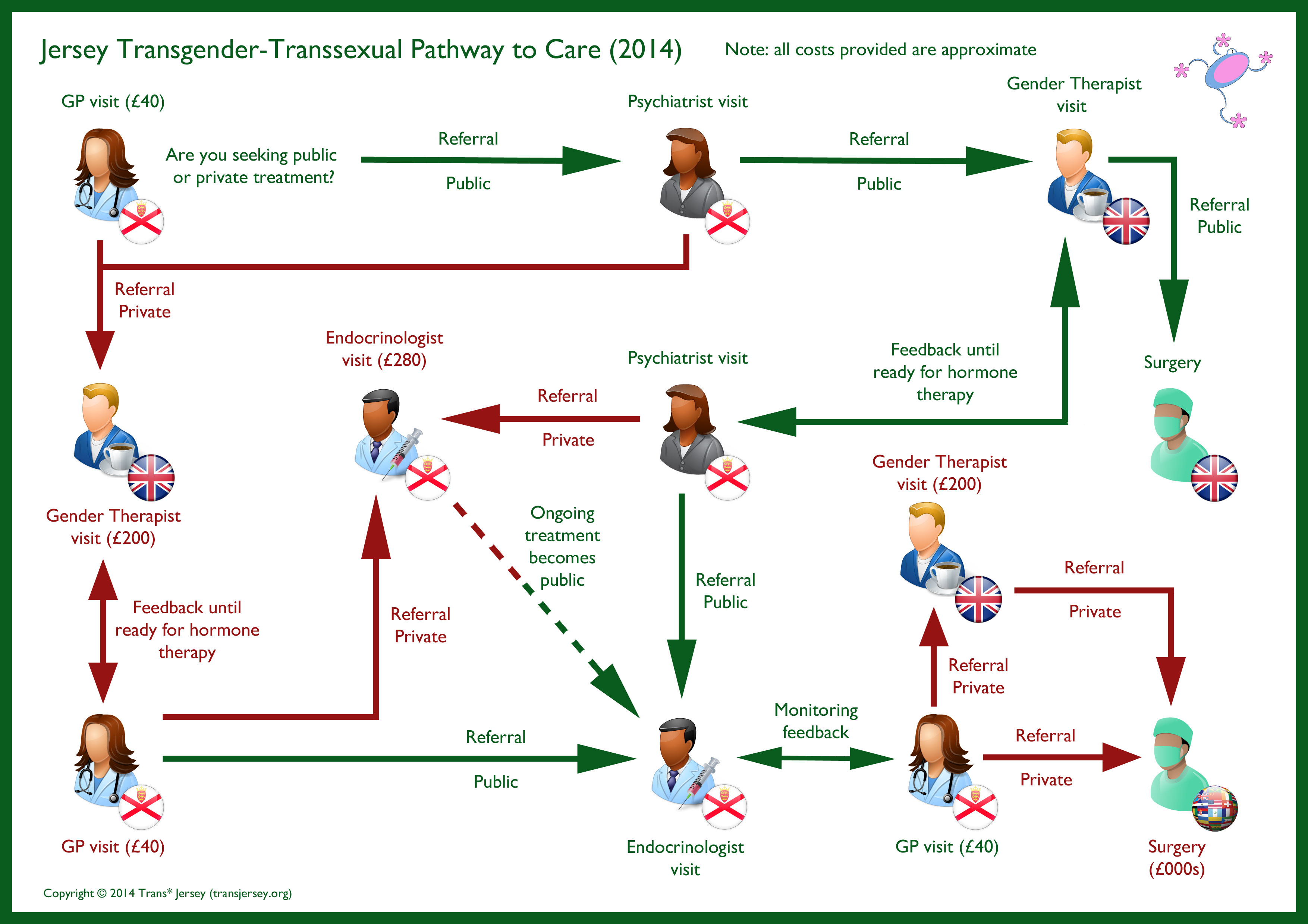 Trans* Jersey is working to clarify the pathway below with the States of Jersey Health and Social Services Department. The question of funding is particularly unclear.