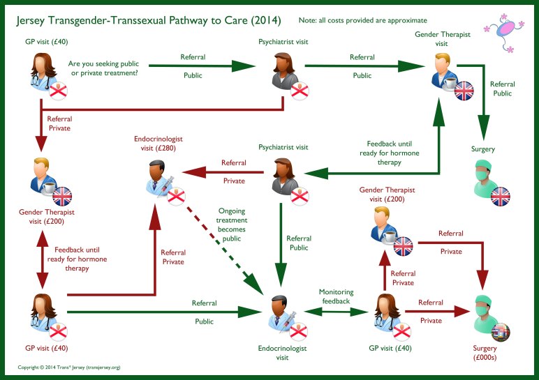 The infographic below is a first attempt to map the pathway to care for transgender/transsexual Jersey residents seeking to transition. It is based on personal testimonies of islanders who have transitioned and, due to the confusing nature of the system at present, may not match your experience. Please email us if you think you can contribute to our findings.